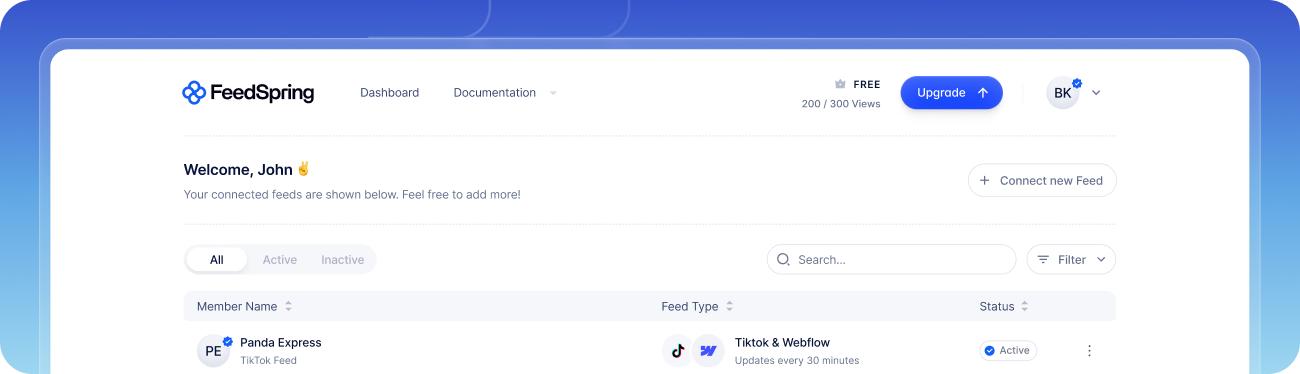 Welcome to FeedSpring's developer documentation! Our guides are designed to help you easily build beautiful custom feeds for any website. You'll find detailed instructions for [Instagram](https://docs.feedspring.com/doc-working/feeds-1/instagram), [Google Reviews](https://docs.feedspring.com/doc-working/feeds-1/google-reviews), [Dribbble](https://docs.feedspring.com/doc-working/feeds-1/dribbble), and [TikTok](https://docs.feedspring.com/doc-working/feeds-1/tiktok) on their respective documentation pages.